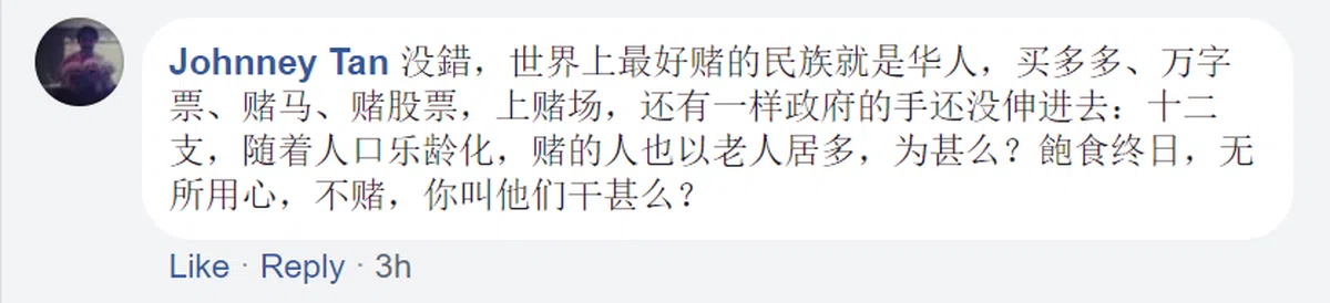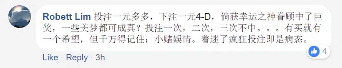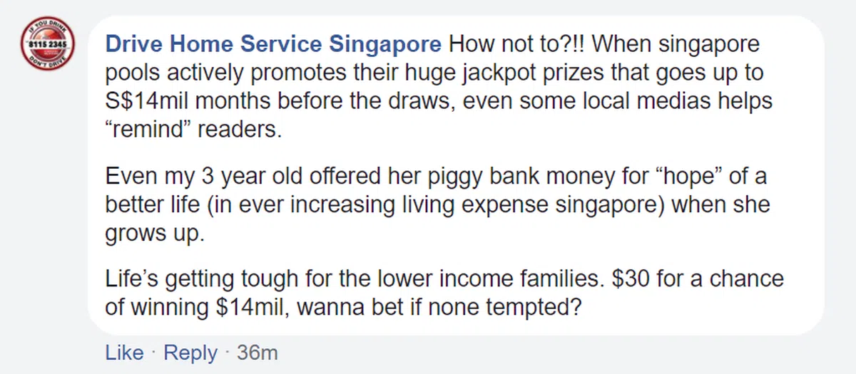 有不少网民半调侃地将责任归咎于新加坡博彩公司(Singapore Pools)的奖金额过于吸引人,让赌徒欲罢不能。