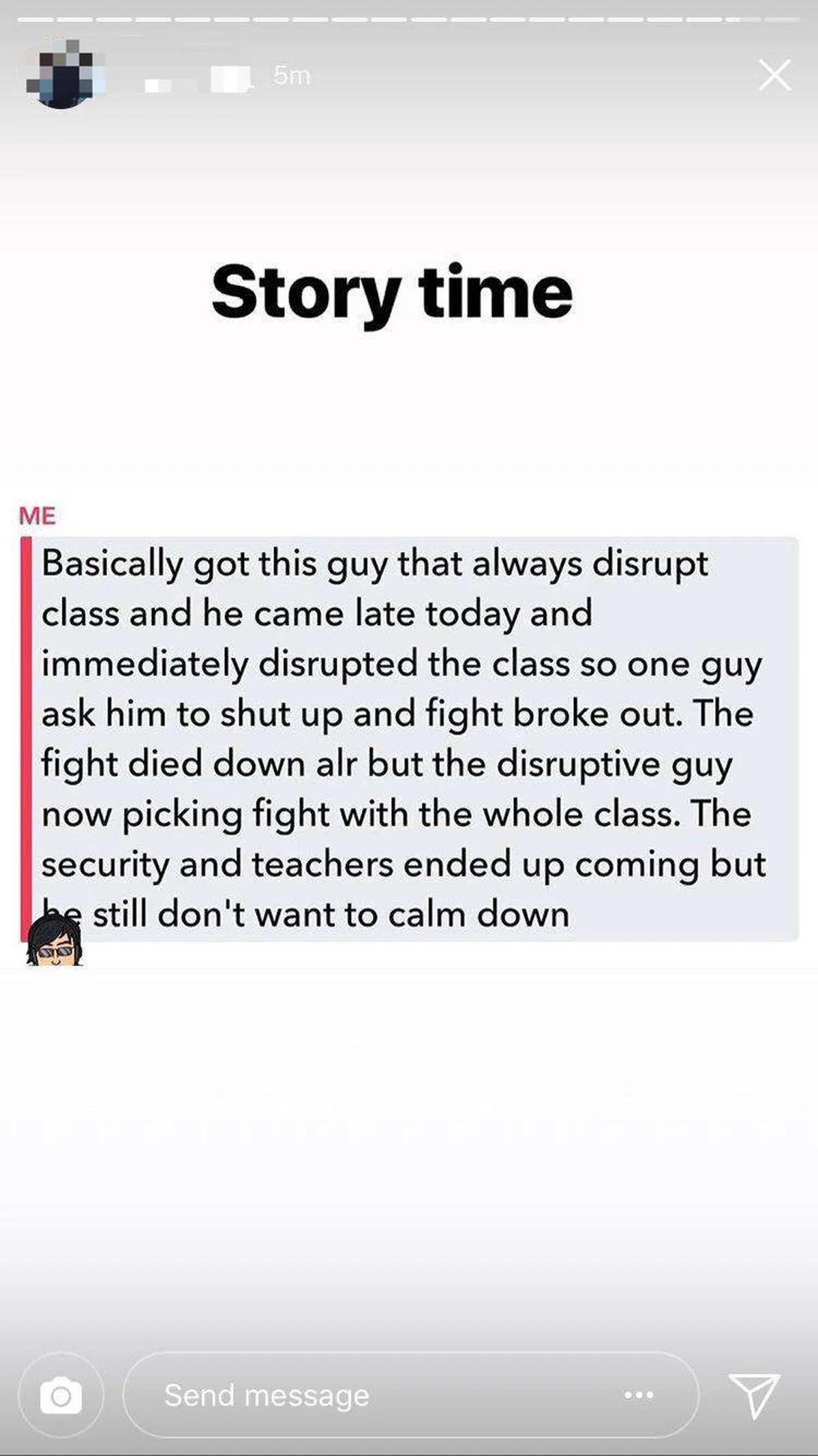 “简单来说,这个学生(金发男)一直扰乱课堂纪律。今天他上课迟到,打扰了同学听课,所以有一名同学就叫他闭嘴,两人就爆发了肢体冲突。”