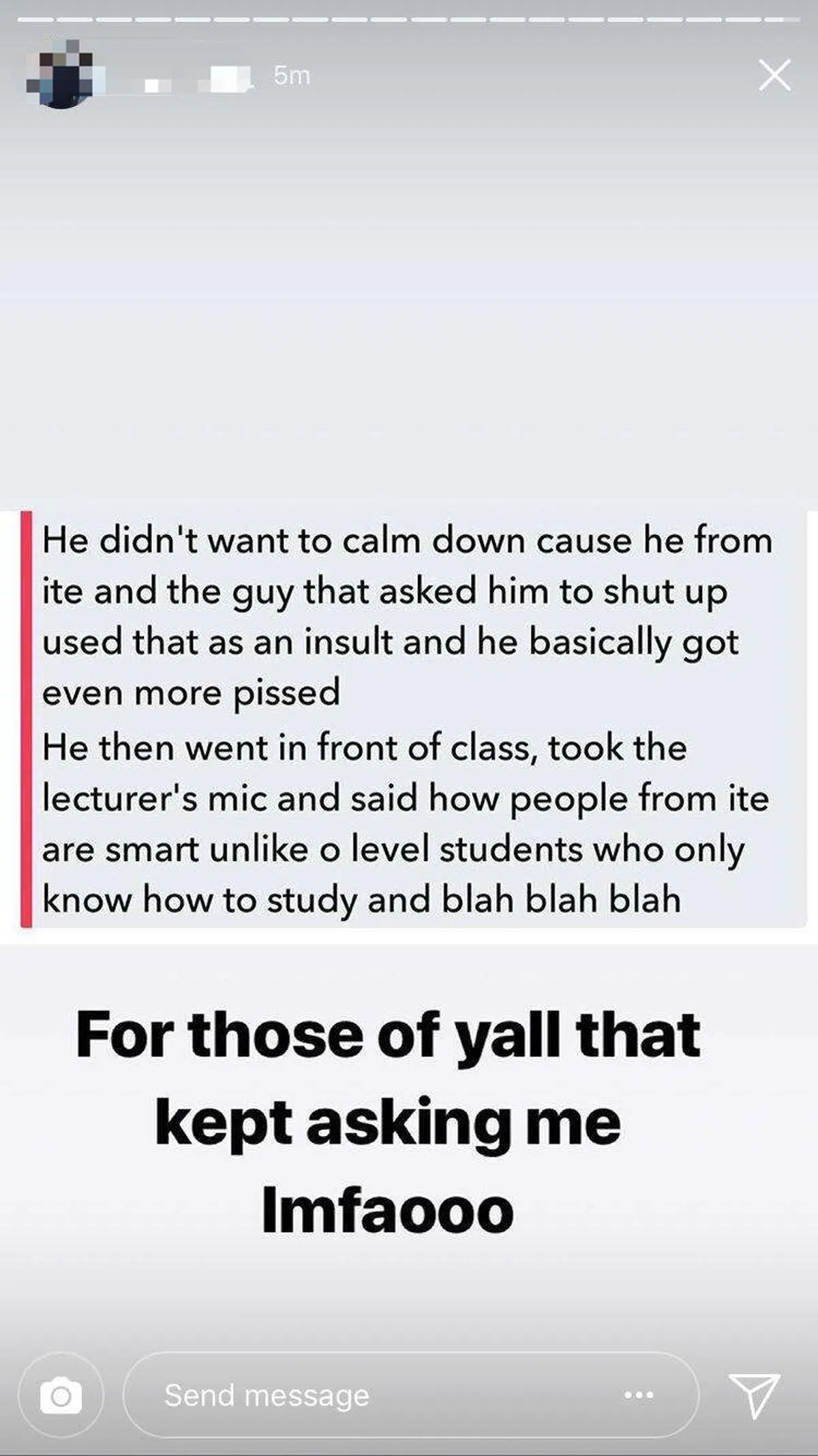 这名学生继续解释:“他无法冷静,再加上另一同学侮辱他是从ITE来的,这让他更加愤怒。接着他就站到讲堂前面,拿起教授的麦克风说,ITE的学生有多聪明,不像O水准考试毕业的学生一样只知道读书……”