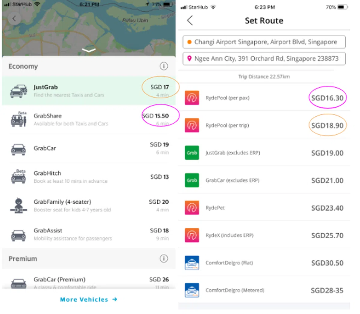 抛开“随需而至”(On-Demand)(换句话说,也就是等候时间)不说,单从价格上来看,Grab似乎略胜一筹。