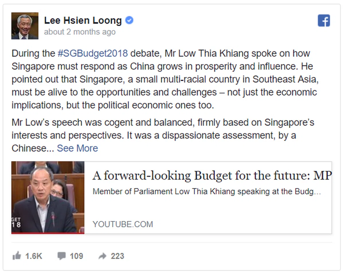 今年三月初,李显龙总理曾用英文在面簿上公开称赞工人党秘书长刘程强的发言"既有说服力又平衡",认为刘程强的谈话是一名受华文教育的新加坡人对中国崛起的冷静评估,凸显了国内政治不应跨出国门的道理,提醒国人在面对外部世界时,须坚守共同国家立场。
