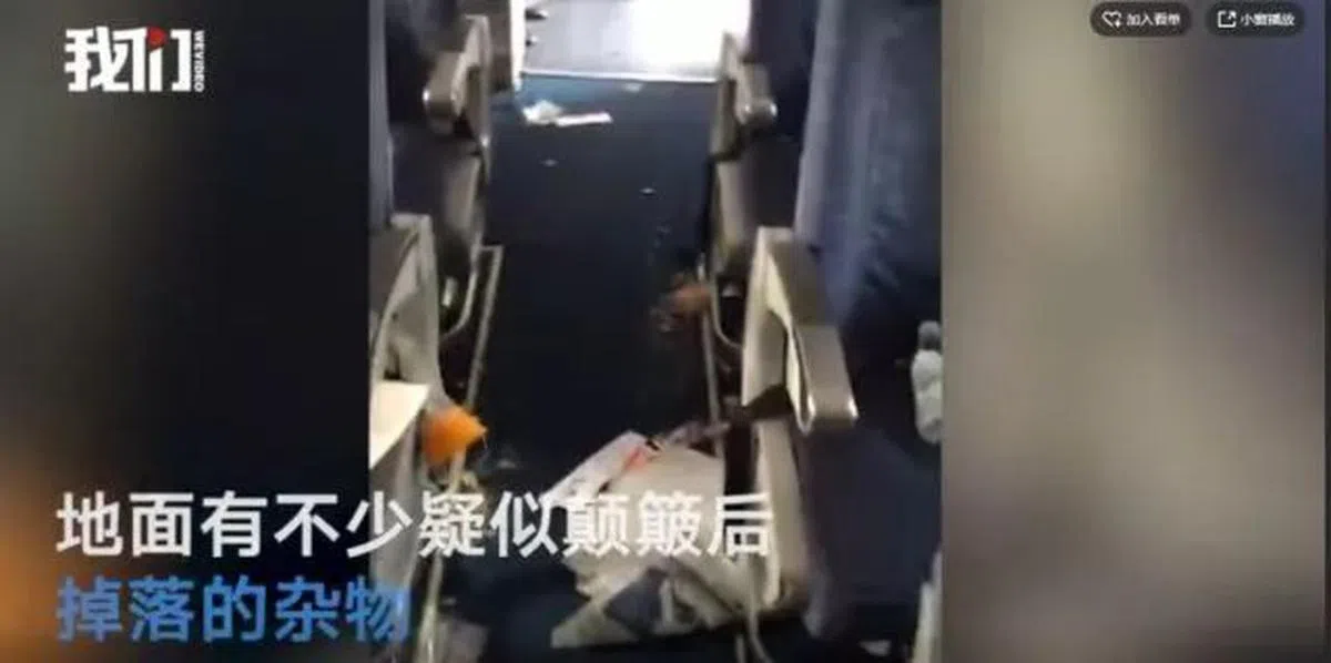 据乘客拍摄的视频画面显示,当时机舱内的氧气面罩已经脱落,空姐也急急忙忙赶回自己的座位。由于飞机颠簸,导致机舱内的杂物散落一地。