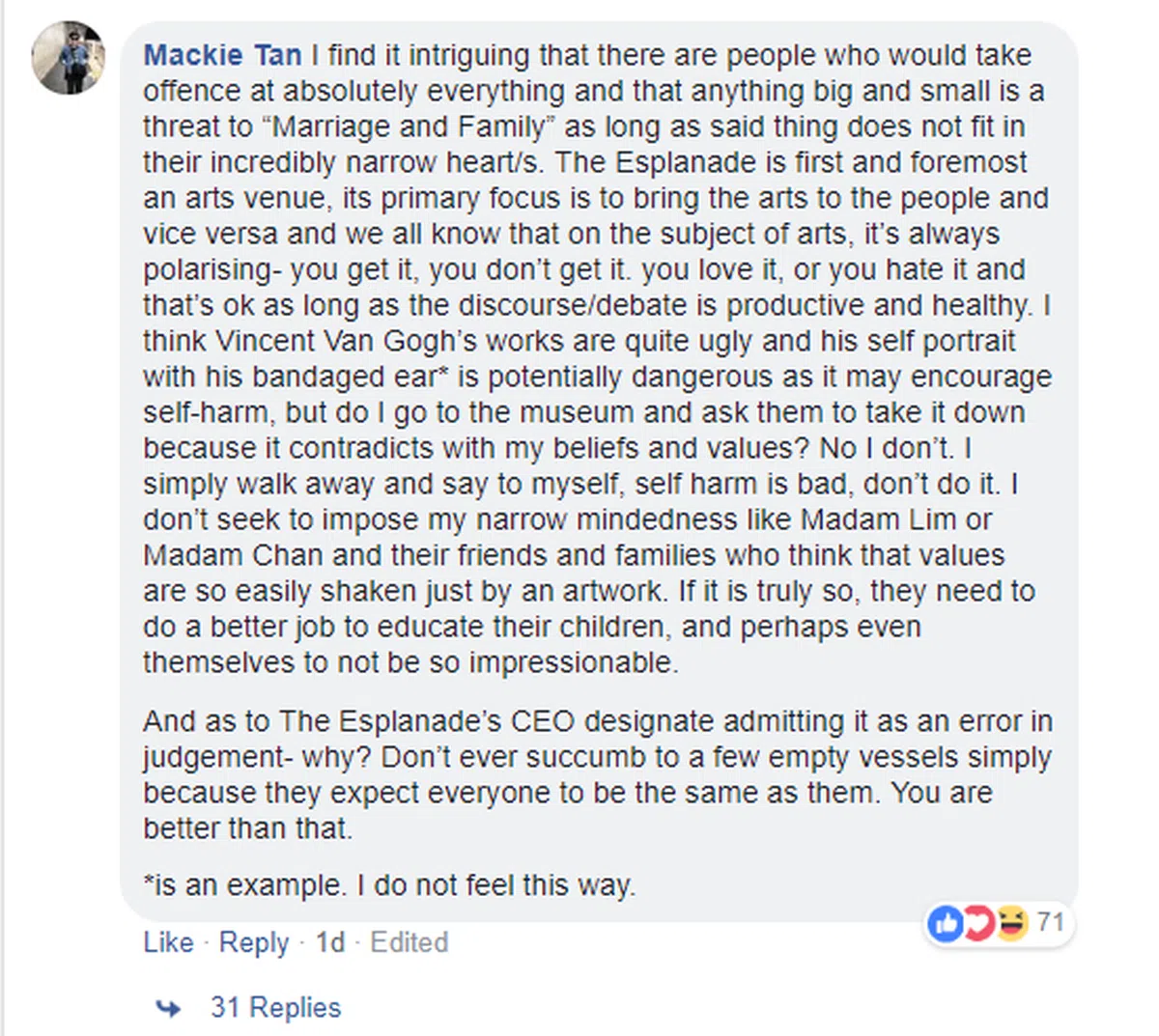 就好比有人认为梵高的画作相当丑,他那幅自画像耳朵被自残裹着纱布,其实有潜在危险,可能会鼓励一些人进行自残。但是我会因为它不符合我的信仰与价值观,而叫一家美术馆将画作取下来吗?我不会。我会走开对自己说,自残是不好的,不要去尝试。我不要像那些思想狭隘的林女士或陈女士和她们的朋友与家人那样,认为一幅画可以轻易动摇价值观。如果真是如此,那他们应该更好地教育他们的孩子,甚至教育自己不要有偏见。