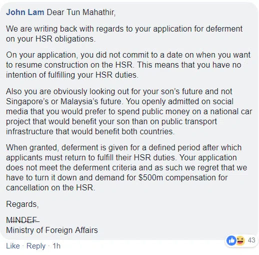 亲爱的敦马, 我们答复你关于申请延迟履行新隆高铁工程的承诺。 在申请中,你没有具体承诺一个你要恢复工程的日期。这说明你没有意思要履行你的职责。 而且,你明显是为了你的儿子未来,而不是为了新加坡或马来西亚的未来。你公开在社交媒体承认,你宁愿花钱在能够让你儿子获益的国产车计划,而不是让两国获益的公共交通设施。 展延执行义务只能是延迟到某一个具体日期,之后申请者就必须回来履行新隆高铁的职责。你要求展延的申请不符合条件,因此我们遗憾地拒绝你的申请,并要求5亿元作为取消新隆高铁工程的赔偿。 敬好, 外交部