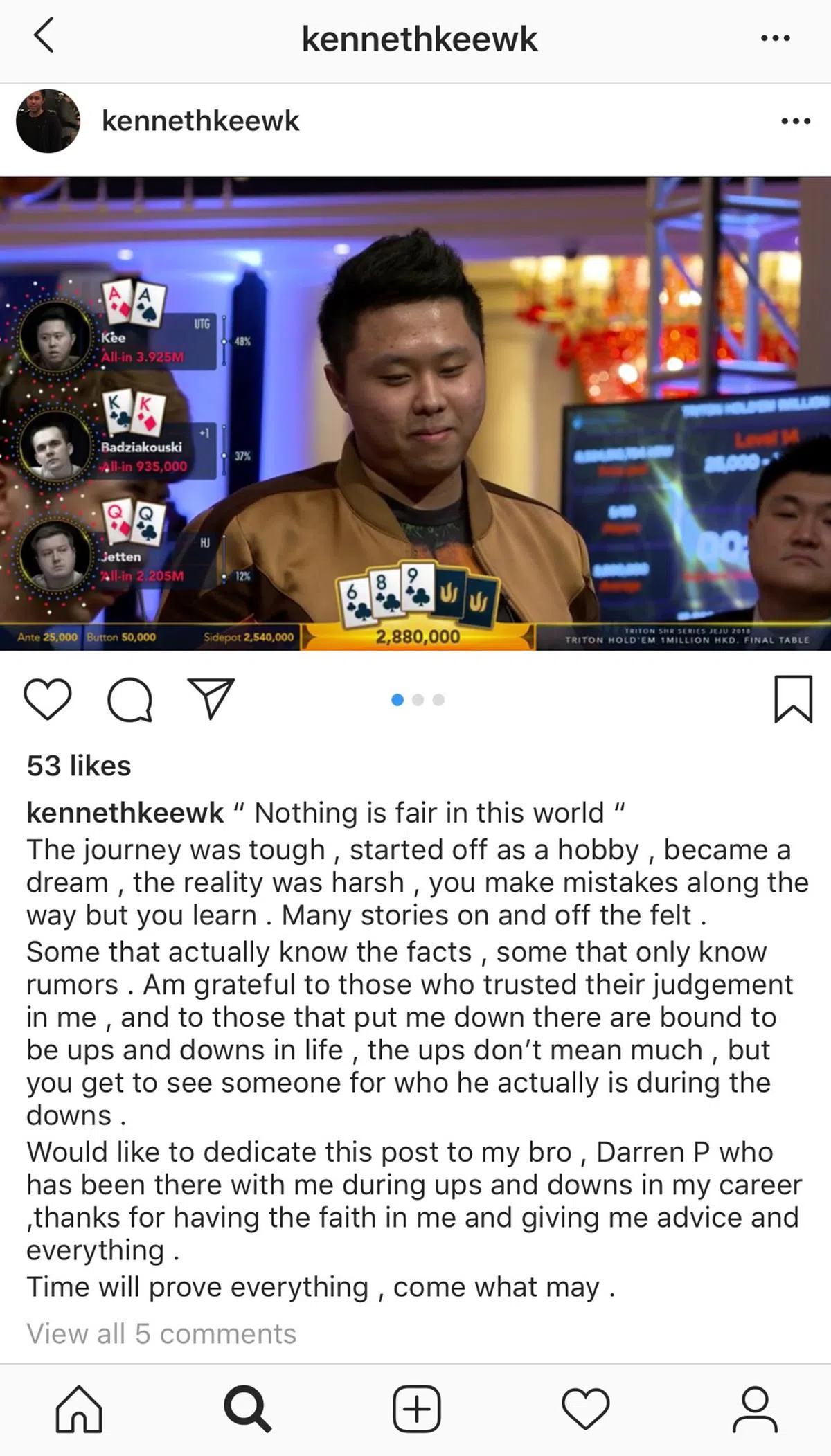 “这世上没有什么是公平的” 这段旅程很艰难。一开始只把它当做是个爱好,但后来变成了梦想。现实是残酷的,你在过程中会犯错,也会学到东西。 有些事情是真,也有些事情只是谣言。我要感谢那些相信我的人,也要感谢那些批评我的人。人生注定有起起落落。巅峰并不重要,你在低谷时才能看清一个人。 我想把这篇贴文献给我的兄弟Darren P,他在我的职业生涯中一直陪伴着我,不论是起是落,谢谢对我的信任和给我的建议和一切。 时间会证明一切,不管发生什么。