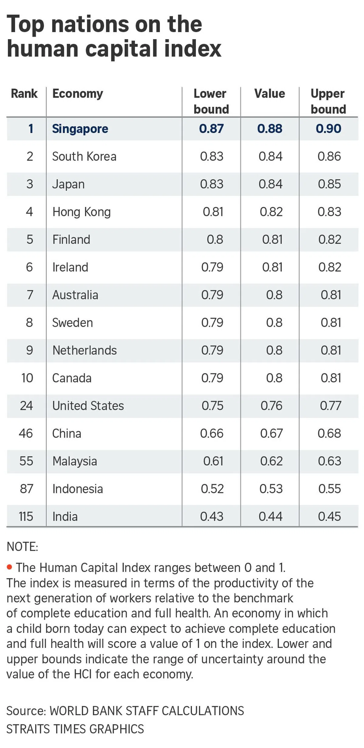 就在今天,有另一份报告出炉了。就是世界银行发布的《人力资本指数》(The Human Capital Index, 简称HCI )报告,称赞新加坡是人力资本发展最好的国家。