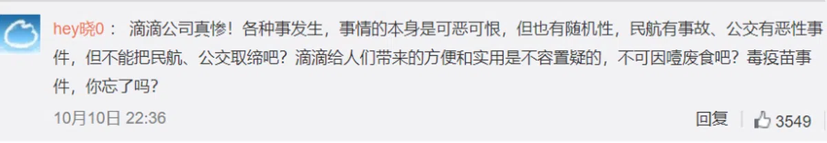 也有网友觉得,滴滴公司太倒霉,各种破事儿接踵而至,但它还是给人们带来了福利和方便,不能因噎废食。
