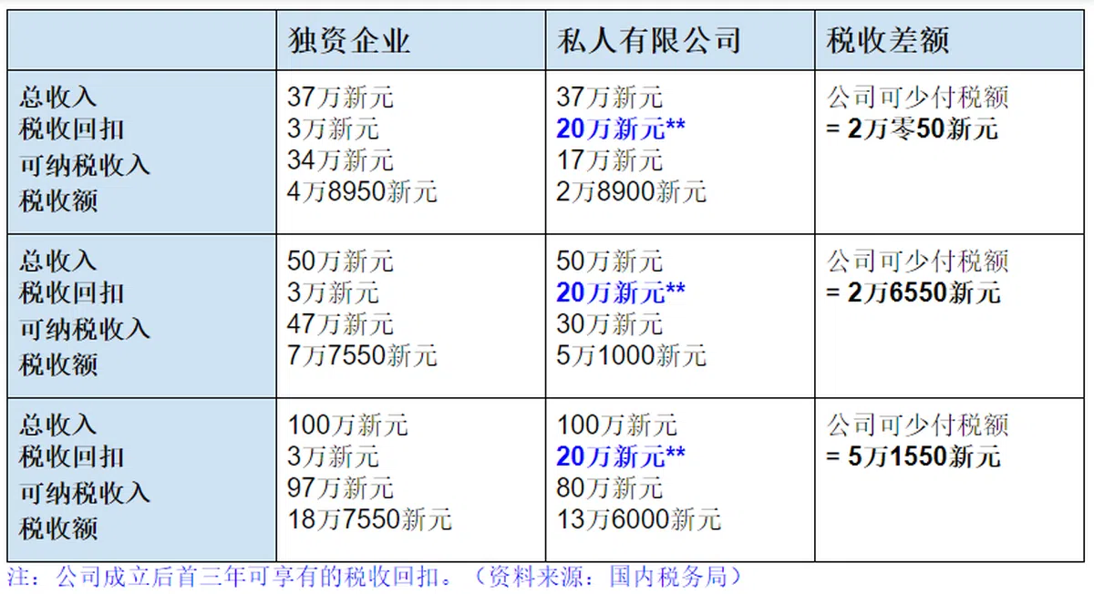 以独资企业(Sole Proprietor)和私人有限公司(Private Limited Company)为例,将两者需缴付的税额相对比,就能看出之间的差额有多可观。