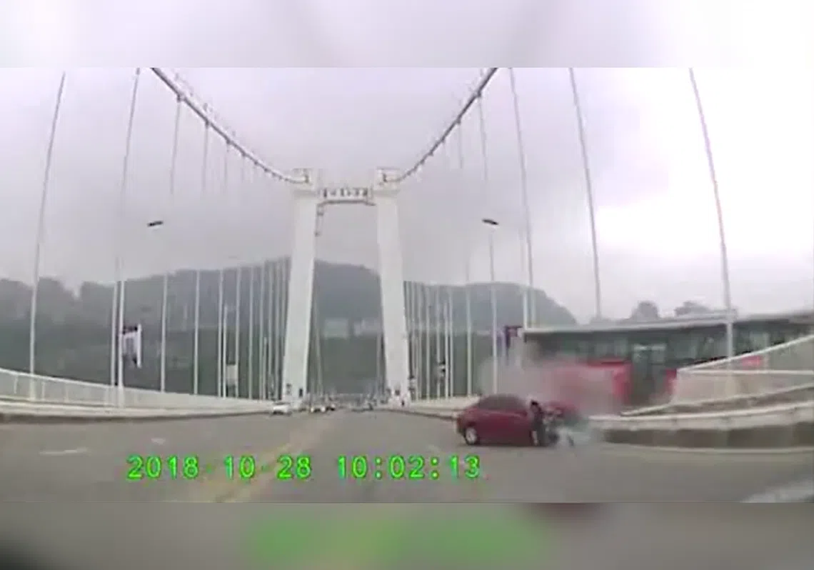 当车行驶至距离一桥头348米的时候,刘某右手拿手机砸向司机的头部,司机右手放开方向盘还击,刘某还不善罢甘休,继续用手机打司机肩膀,司机用右手格挡,然后猛然回神收回右手并往左侧急打方向盘,就这样整辆公车失控撞向另一辆红色轿车,然后撞断护栏,连车带人一起坠入江中。