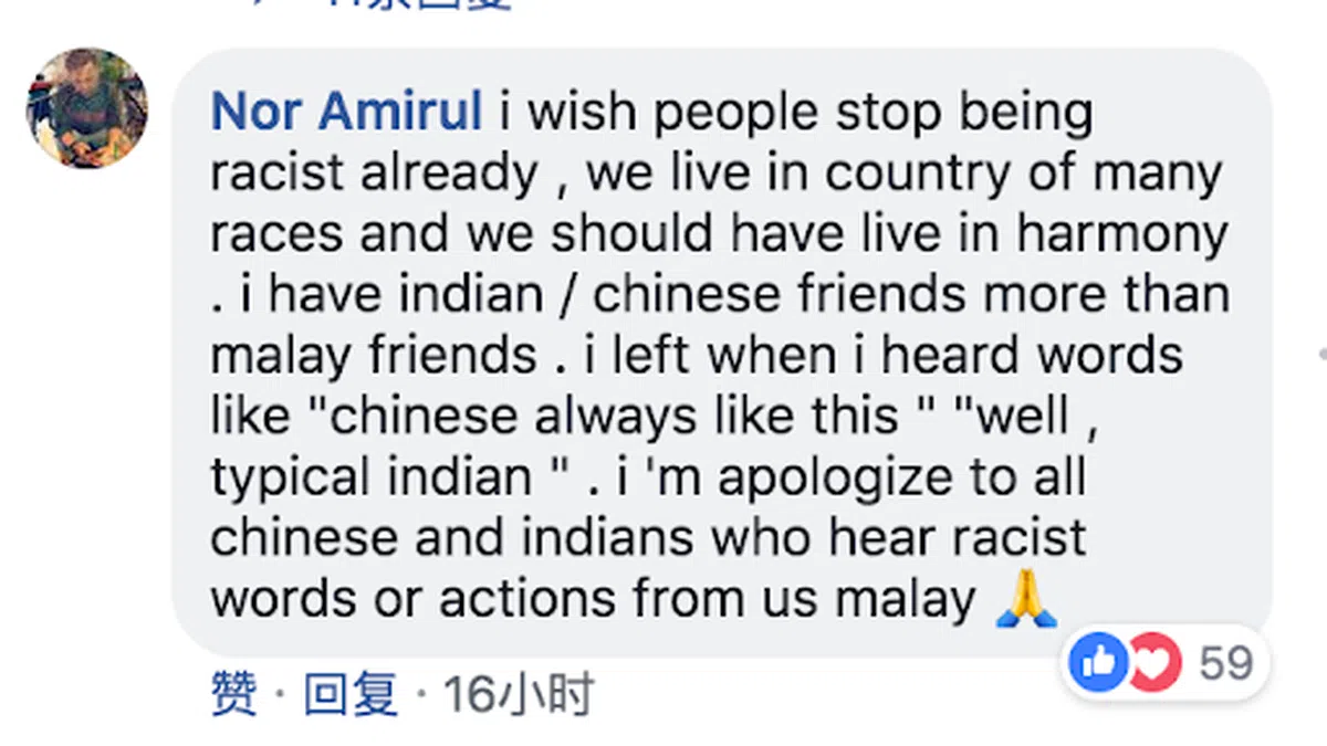 我希望人们不要再种族歧视了,我们活在一个多元种族的国家,我们应该和谐共处。我的印度和华族朋友比马来朋友多,每当我听到“华人总是这样”,“好吧,典型印度人”这种话我就会离开。我替所有从我们马来人口中听到种族歧视言论的华族和印度族道歉。