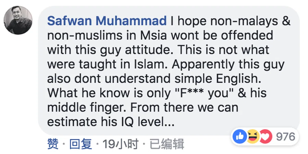 我希望非马来族和非穆斯林同胞不会被这个人的态度影响。伊斯兰教不是这样教我们的,很明显这个人不明白简单的英语,他只知道“Fxxx you”和他的中指。从这些我们可以得知他的智商水平......