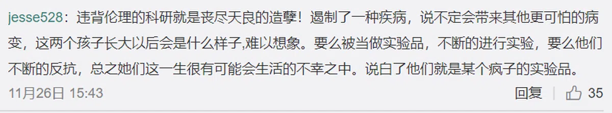 几个小时后,舆论氛围很快就从“厉害了我的国”的“正能量”转向“疯狂行为”的“负能量”指责声浪。百名科学家联名反对、医院否认、深圳卫生计生委介入、中国国家卫健委回应,一系列的科普以及官方发声,都在否定这项“历史性突破”。