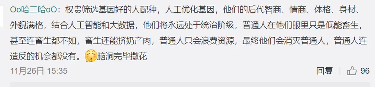 无独有偶,本地网民也担忧,权贵会通过基因改造世袭统治,未来富的更富、贫的更贫。