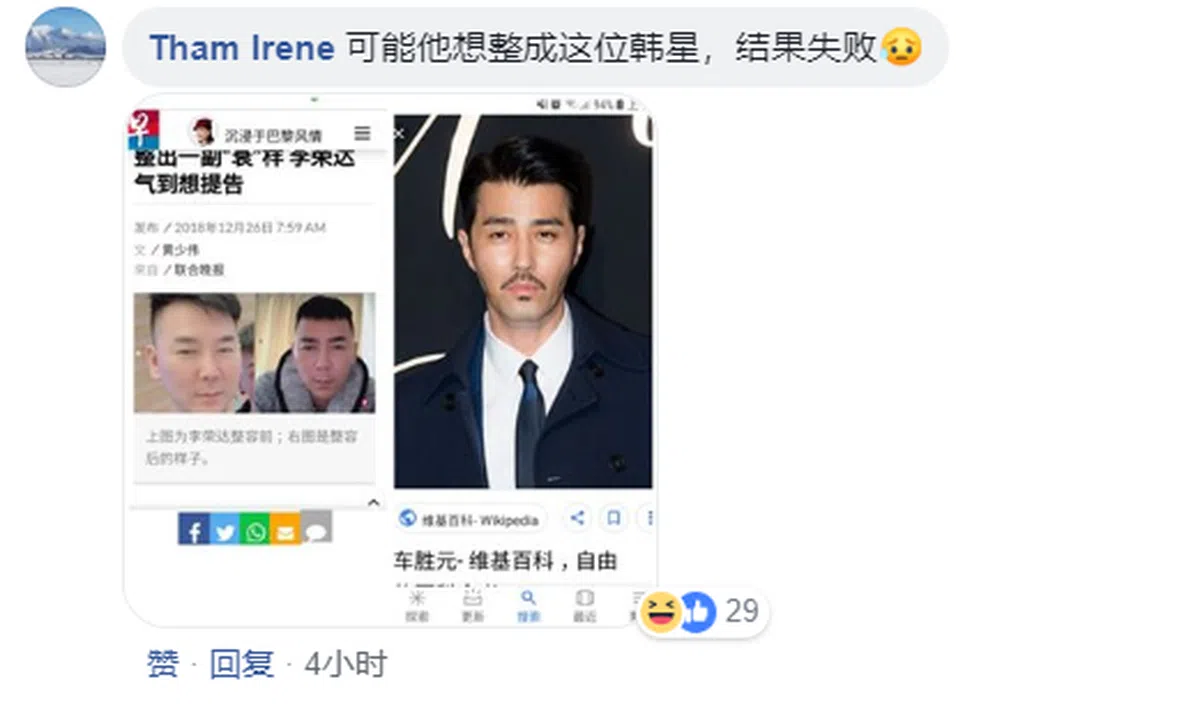 有网友点醒大家,说李荣达可能是想整成韩星车胜元,但是失败。