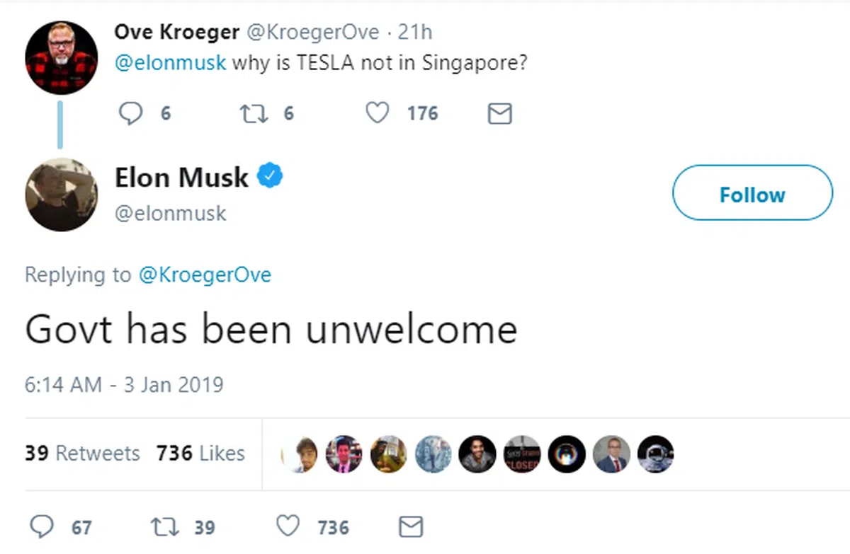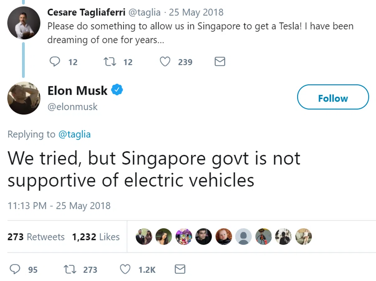 “@elonmusk 为什么TESLA还不来新加坡?”