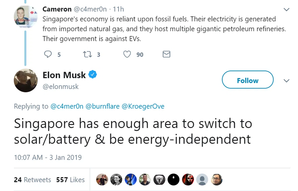 接着有网民答复马斯克说,“这很可能与新加坡的经济依赖矿物燃料有关,他们还在使用进口的天然气来发电,也有许多巨型炼油厂,他们的政府是反对电动交通工具的。”
