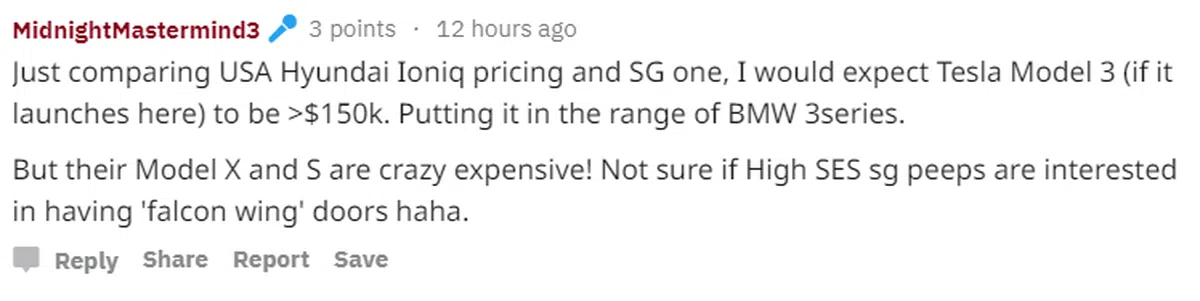 “以特斯拉3系列车型为例,一辆的售价都在15万新元以上,价格可媲美宝马3系列汽车。如果是特斯拉X系列和S系列,那简直贵得离谱。不知道新加坡那些高社会经济地位的人会不会有兴趣开一辆有‘鹰翼’门的汽车。哈哈”