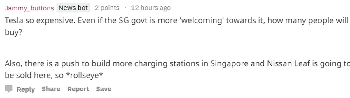“特斯拉太贵了。即使新加坡政府对它比较“欢迎”,又有多少人会买?再说了,新加坡正在建设更多电动汽车充电站,而且日产电动车Leaf聆风也即将在新加坡售卖,所以*翻白眼*……