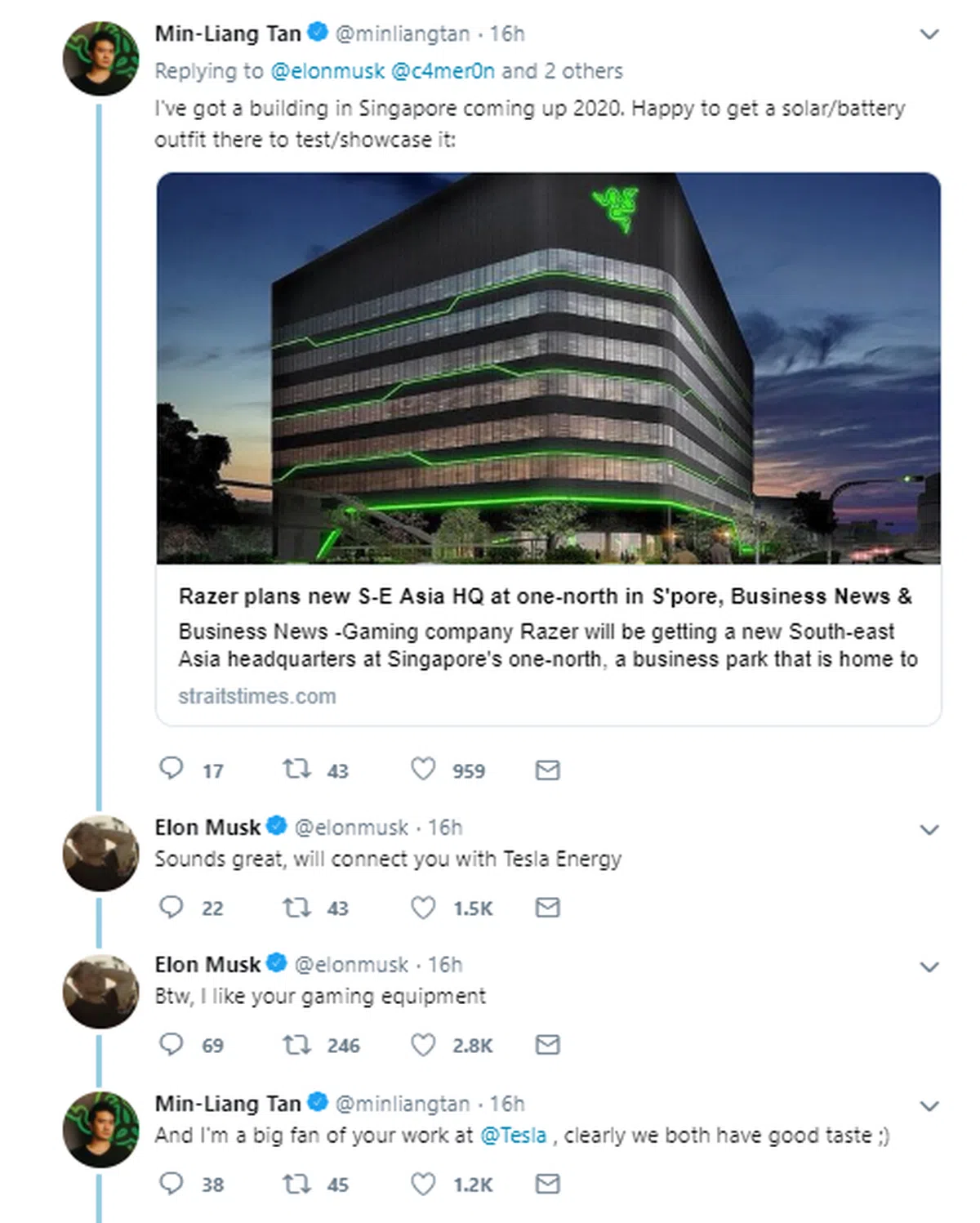 “我在新加坡的(雷蛇)大楼2020年将建成。我可以在那里放置一个太阳能电池装备来测试与展示。”(然后附上《海峡时报》关于雷蛇大楼的相关新闻报道的链接)