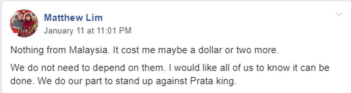 有群组成员发了一张包含蔬菜、水果和肉类的食物照,然后留言说:“没有一样是马来西亚的,虽然我得多付一元或两元,但我们不需要靠他们。我希望让大家知道,这是可以做到得。我们尽自己所能,对抗那位翻印度煎饼高手(意指马国首相马哈迪)。”