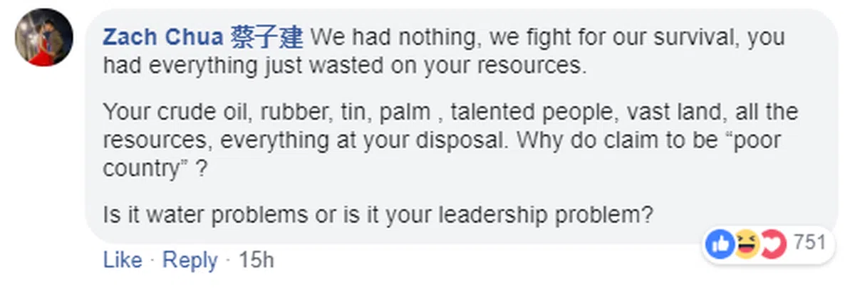 “新加坡迅速发展是因为我们给他们提供水,不过我发现柔佛人很少谈论这件事……富国靠穷国?这不只不合逻辑,还是道德上不正确的行为。我们必须在这件事上施压。”