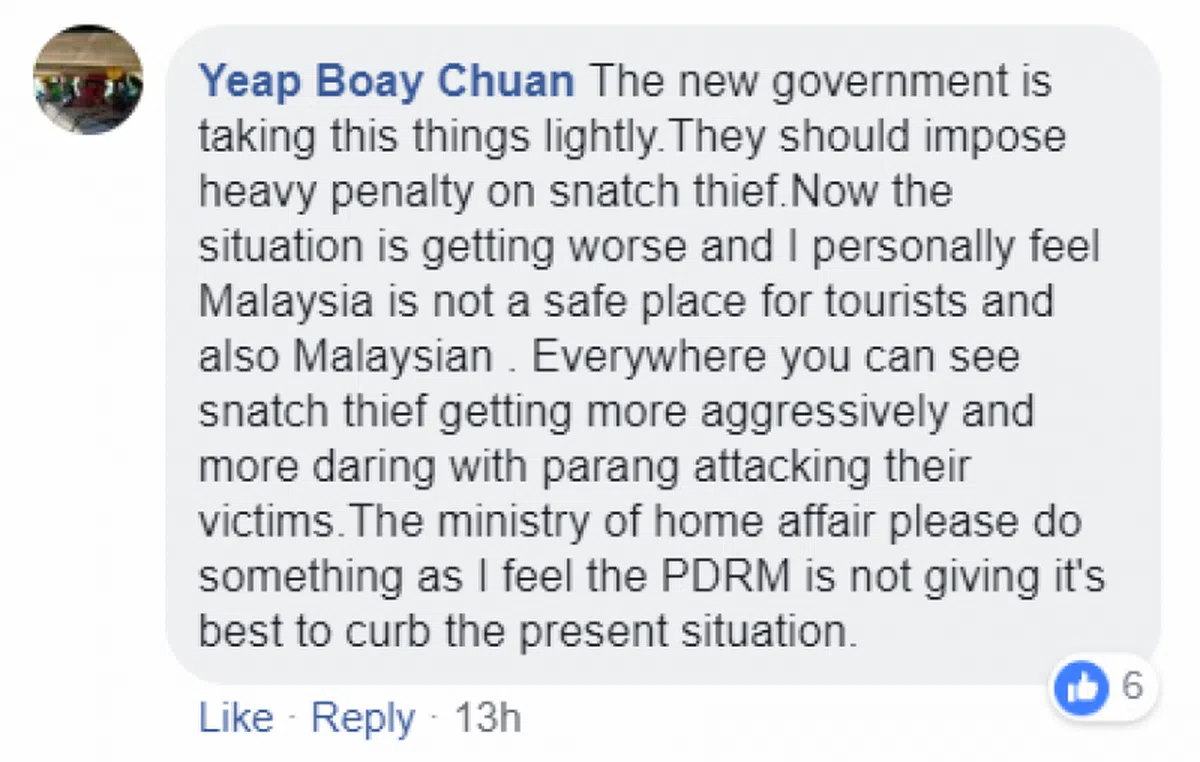 “新政府似乎不太重视这样的事情。他们应该通过严刑峻法取缔这些掠夺匪。现在情况越变越糟,我个人认为,对于游客甚至马国公民而言,马来西亚已经不再是个安全的地方。到处都能看到掠夺匪,他们越来越暴力,甚至出动巴冷刀袭击受害者。恳请内政部尽快采取行动,因为马来西亚皇家警察并没有尽其所能来控制目前的局势。”