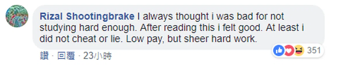“我一直为自己不够努力念书感到难受,但看到这(报道)我感觉好多了,至少我不欺骗也不说谎。薪水不高,但至少那是我辛苦所得。”