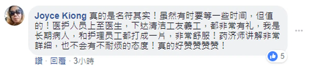 “真的是名副其实!虽然有时要等一些时间,但值得!医护人员上至医生,下达清洁工友义工,都非常有礼,我是长期病人,和护理员工打成一片,非常舒服!药剂师讲解非常详细,也不会有不耐烦的态度!真的好赞赞赞赞!”