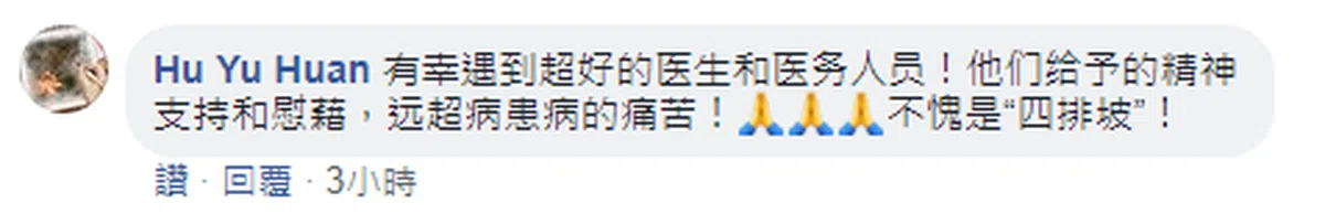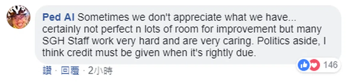 “有时候我们不懂得感恩我们所拥有的……(新加坡中央医院)当然无法尽善尽美,也有许多可以改善的空间,但很多新加坡中央医院的职员都非常努力工作,也非常有爱心。把政治放一边,我认为该论功行赏的时候我们还是要给予肯定。”