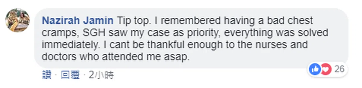 “顶呱呱。我记得有一次我有胸闷的状况,新加坡中央医院把我的病例列为优先处理,一切状况马上迎刃而解。对于当时立即前来照护我的护士和医生们,言语不足以表达我的谢意。”