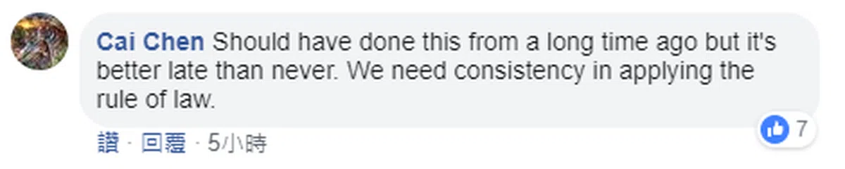 “早就该做了,但也好过从来没做。我们需要始终如一的维持法治。”