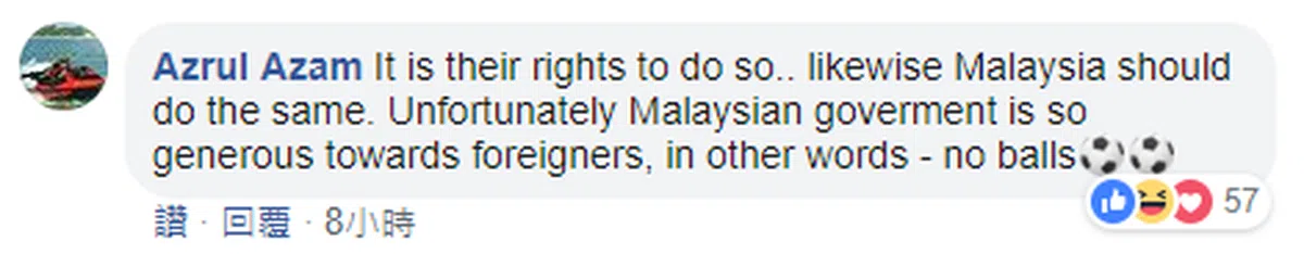 “他们(新加坡)有权力这么做。同样的,马来西亚也应该这么做。无奈马来西亚政府对外国人很大方,换句话说,没种!”