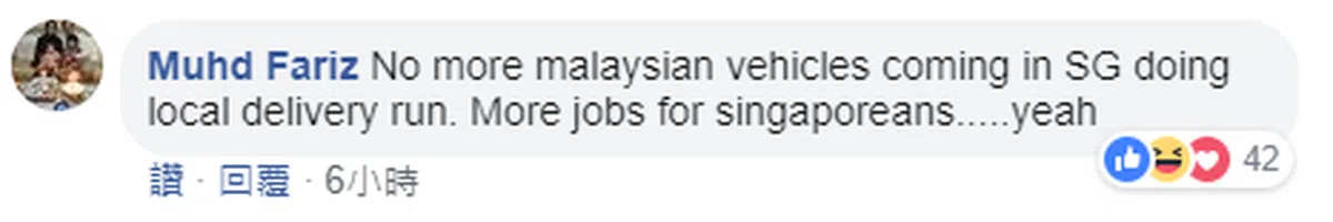 “没有马来西亚车辆进来新加坡送货。新加坡人会有更多工作……太好了!”