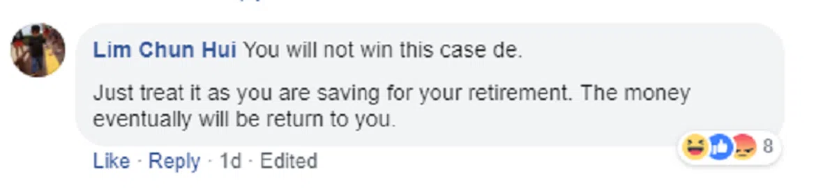 概括来说,Valerie未满55岁,如果又不想永久离开新加坡,那她是赢不了公积金局的,还得照偿还贷款,不如像以下这位网民乐观地想:就当为退休存钱,钱最终会还给你的。