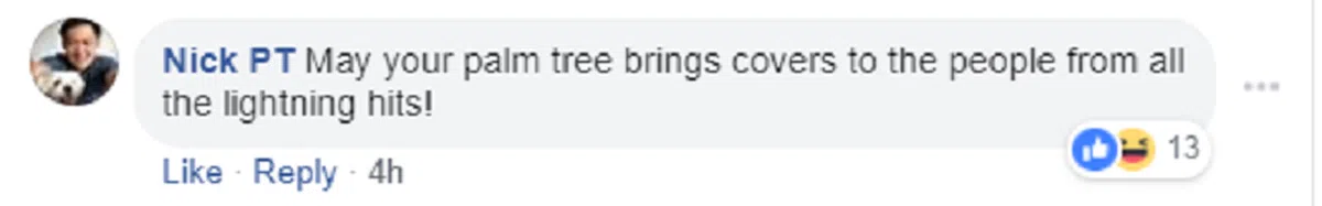 话说回来,不少网民很欣赏这个标志的,说这棵树功能强大。闪电(人民行动党的党徽)会击中人们,这棵棕榈树却会拯救躲在树下的人。