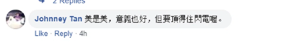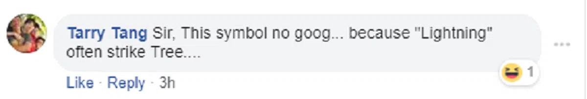 这位网民还说,这个标志兆头不好,因为闪电(一语双关,人民行动党的党徽就是闪电)常常击中大树。