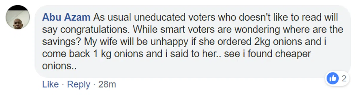 “跟往常一样,那些没有受教育的选民,而且又不喜欢阅读新闻的人,肯定会高喊恭喜。不过比较聪明的选民肯定在想,哪有省下钱?我老婆如果叫我去买两公斤洋葱,然后我只买了1公斤洋葱回家,然后对她说……你看,我买到便宜的洋葱……我老婆肯定会脸黑黑。”