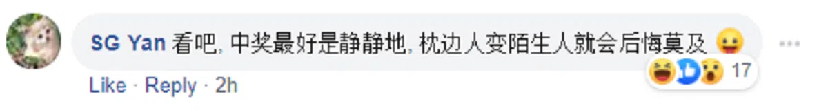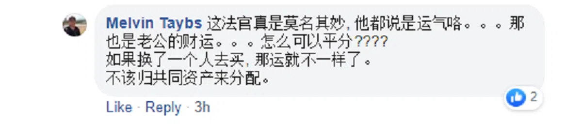这个新闻一出街就引起热议,网民炸开锅似地评论,看来马票话题是大家永恒的共同兴趣。大家纷纷为丈夫打抱不平,说运气和财运都是个人的啊,要怎么平分?换个人买就不一样了。