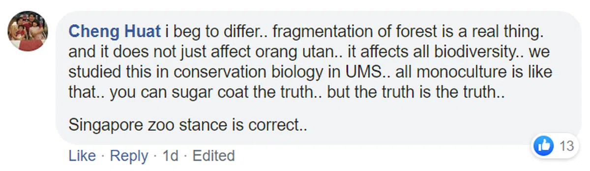 “我持不同意见……森林在碎片化是真实发生的事。它不只影响红毛大猩猩,还影响生物多样化。我们在马来西亚沙巴大学的生物保育课程上有学过……你可以为真相裹上糖衣……但真相还是真相。新加坡动物园的立场是对的。”