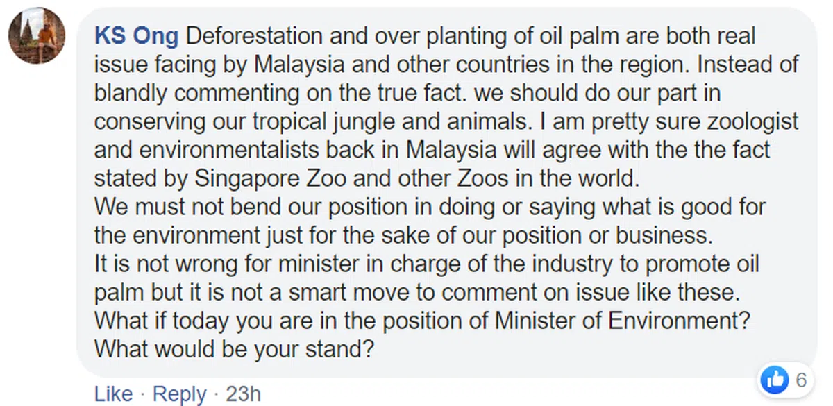 “非法砍伐森林和过度种植棕榈的确是马来西亚和本区域其他国家面对的真实问题。与其出手反驳真相,我们必须尽力保护我们的热带森林和动物。我相信马国的动物学家和环保人士都会同意新加坡动物园和世界其他动物园所指出的真相。我们不能一味为了坚持自己的立场和维护我们的生意而扭曲那些对环境有益的做法。身为原产业部长,积极宣传棕油是没错,但对这样的课题作出这样的发言,并不是高明的做法。如果今天换作你处在环境部长的位置,你还会坚持同样的立场吗?”