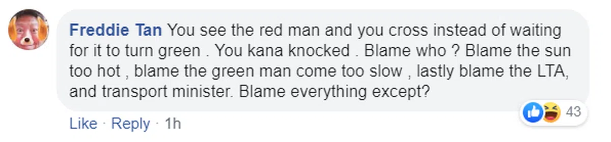 这个网民说,你看到(交通灯的)“红人”,你没有等它转绿,而是继续过马路,然后你被车撞。这要怪谁?怪太阳太热,怪“绿人”姗姗来迟,最后再怪陆路交通管理局和交通部长?怪所有的一切,就不是怪(自己)?