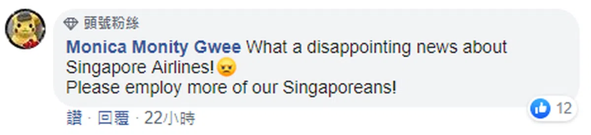 “新航的这个新闻真让人感到失望!请招聘多一些新加坡人!”