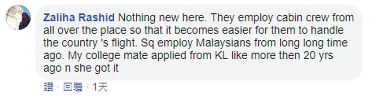 “这不是什么新鲜事。他们从世界各地聘请空服员,以便更易于管理相关国家的航线。新航从很久以前开始就在聘请马来西亚人了。我的学院同学在20多年前就是在吉隆坡申请(当空服员)的,最后也被录取。”