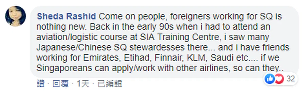 一些网民则跳出来为新航召募外籍空服员的政策缓颊: “大家,外国人为新航工作已经不是新鲜事了。早在90年代早期,我去参加一个航空/物流课程时,就在新航的训练中心看到许多日本和中国籍的新航空姐……而我也有朋友在阿联酋航空、阿提哈德航空、芬兰航空、荷兰皇家航空和沙地阿拉伯航空等航空公司工作……如果我们新加坡人可以去其他航空公司申请工作,他们当然也可以。”