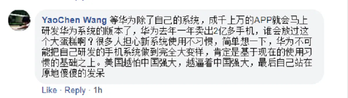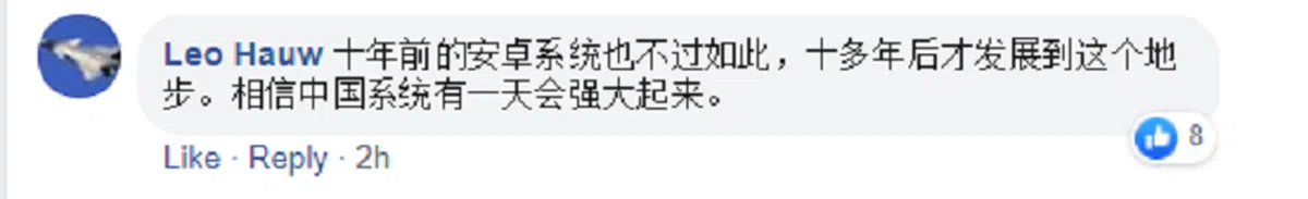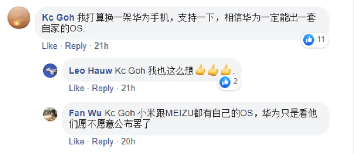 尽管如此,新加坡网民依然选择力挺华为,认为它一定会研发出属于自己的系统,从此不用再靠别人。有人说,要以实际行动支持华为------买华为手机。