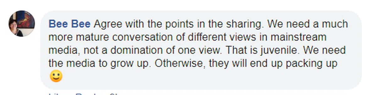 “同意交流中提到的几个点。主流媒体需要一个涵盖不同观点的成熟对话,而不是一面倒的单一观点。这很不成熟。媒体需要成长,不否则他们会落得收拾包袱的下场。”