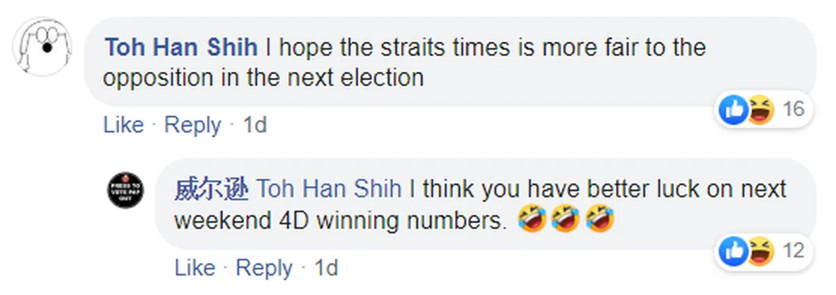 网民:“我希望海峡时报在下一届大选中的报道对反对党更公平些。” 回复:我想你下个周末中万字票4D的可能性会更高一些。