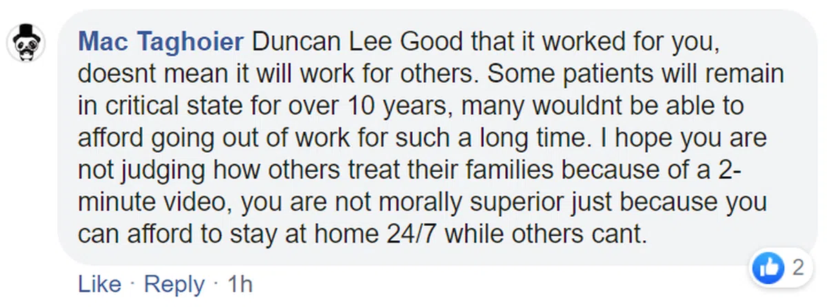 “Duncan Lee很高兴看到你这么做行得通,然而并不代表这个方法对他人而言行得通。有些病人会一只停留在严重的阶段超过10年,有很多人根本无法这么长时间不外出工作。我希望你不是基于2分钟的视频就给对方的家庭下判。你能够全天候留在家不代表你在道德上就比他人清高,因为其他人根本无法做到。”