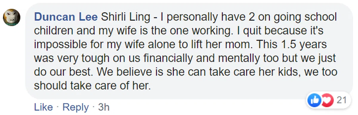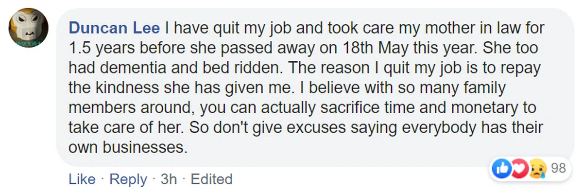“我辞掉了工作来照顾我的岳母长达1年半,直到她在今年5月18日过世。她也患上失智症,行动不便只能卧病在床。我辞掉工作的原因是为了回报她的恩情。我相信有那么多家人在旁,你应该能够牺牲一些时间和金钱来照顾她。所以请不要再找借口说每个人都很忙有自己的事情要处理。”