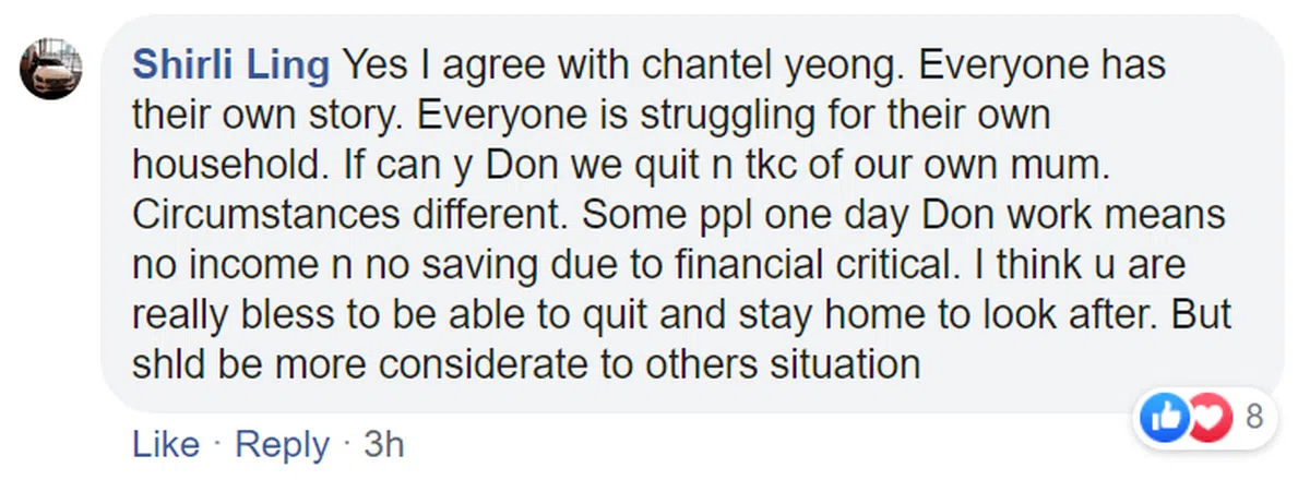 我同意Chantal Yeong所讲。家家有本难念的经。每个人都在挣扎着为各自家庭讨生活。如果可以的话,我们也想辞掉工作来照顾自己的母亲。但情况不同于往日。有些人一天不工作就没收入,而且经济拮据也没有存款可用。我认为你是有福气的人,能够辞掉工作留在家照顾老人。但希望你对他人的情况更富有同理心。